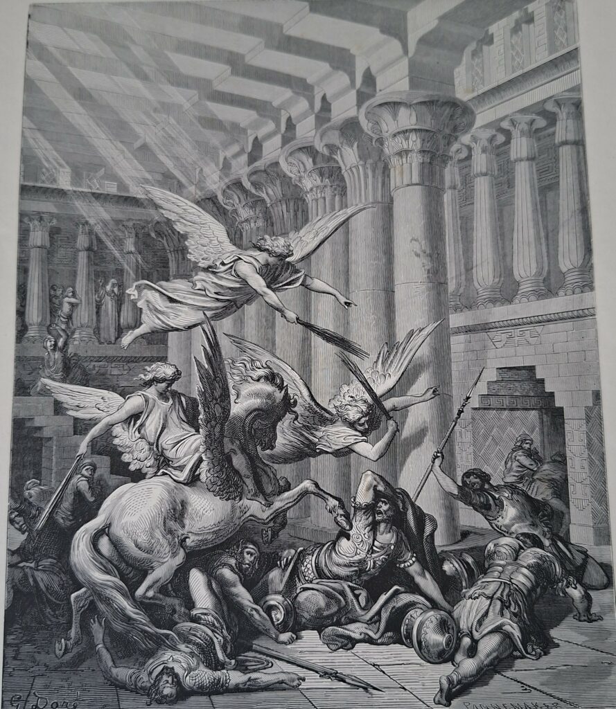 Gustave Doré met en scène l’irruption brutale du surnaturel dans un espace architectural monumental inspiré de l’Antiquité. Le dynamisme des corps, la violence des gestes et le contraste entre la puissance angélique et la faiblesse humaine soulignent la toute-puissance divine face à l’orgueil des hommes. Cette image, d’une grande intensité dramatique, illustre la protection accordée par Dieu à son Temple et rappelle que toute profanation appelle un châtiment immédiat.