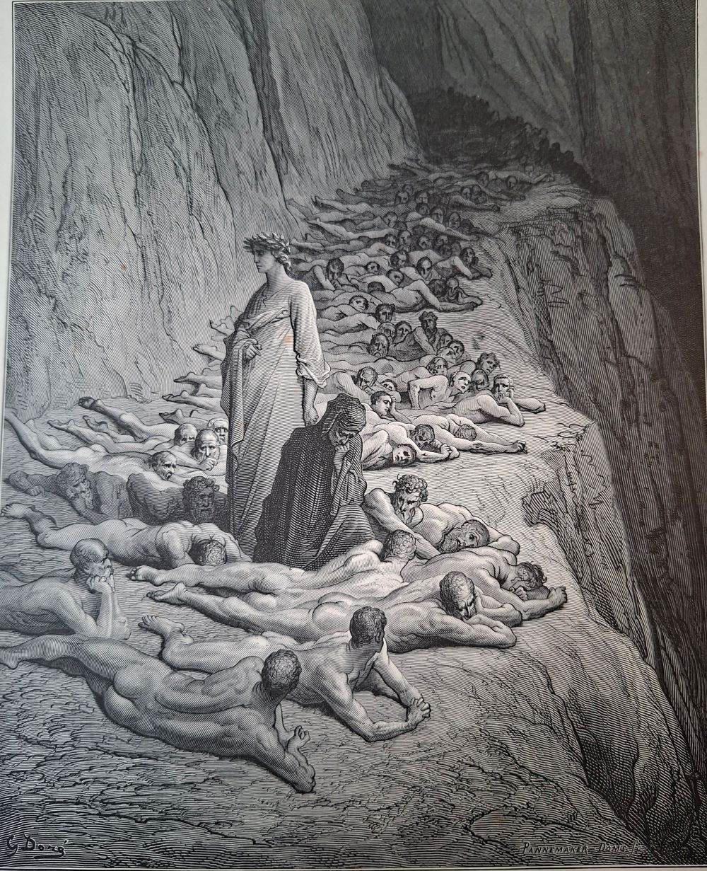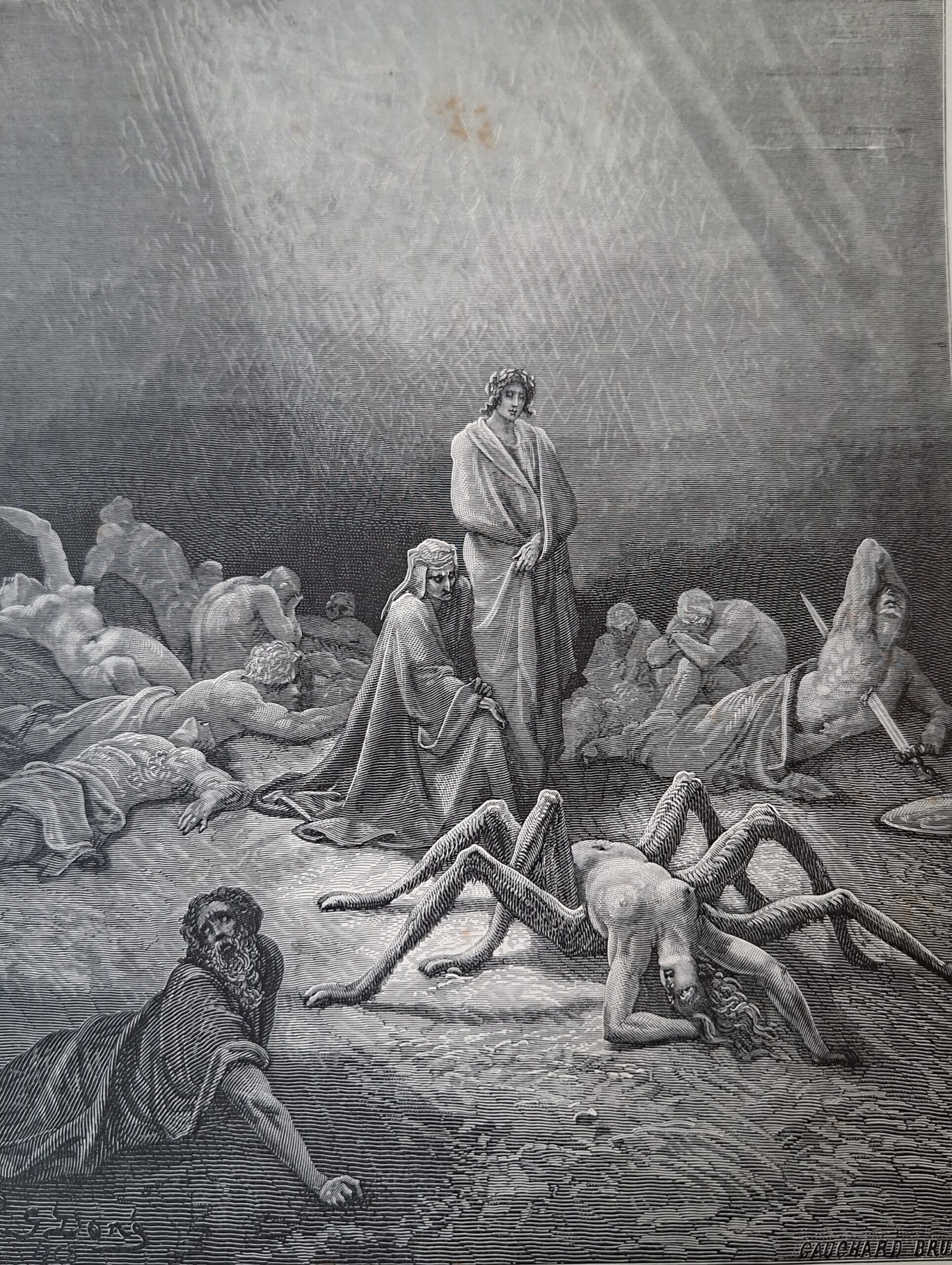 Héliodore chassé du Temple Noé envoie une colombe vers la terre Une scène du déluge Dieu fait périr le léviathan Les Furies et l’apparition de Méduse Les Orgueilleux sous le poids de la pénitence Dante et Virgile devant le géant Antée Dante et Virgile devant l’image d’Arachnée Dante et Virgil rencontre le Minotaure Minos, juge infernal au seuil du deuxième cercle